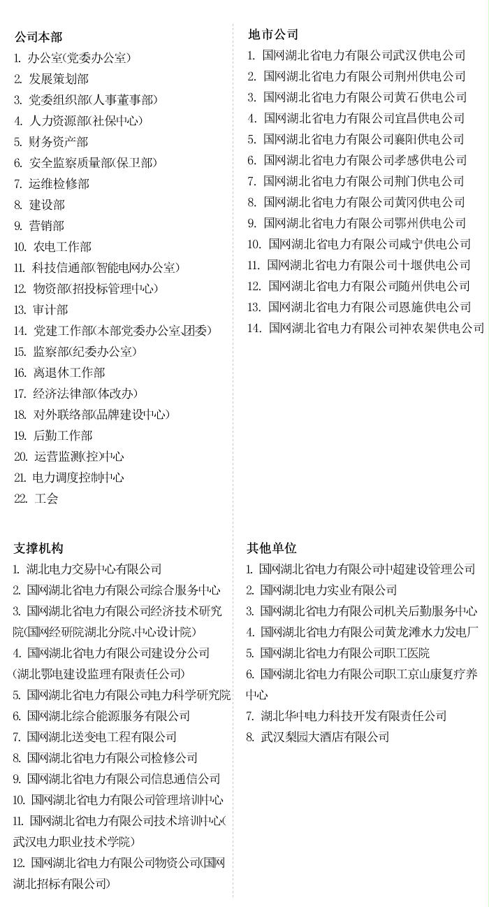 国网湖北省电力有限公司党委成立于1999年8月,对全省各市、县供电企业及所属单位党组织实行统一管理。公司党委坚持以习近平新时代中国特色社会主义思想为指导,深入贯彻执行党的路线方针政策,全面落实国家电网 【详细】