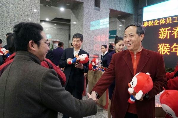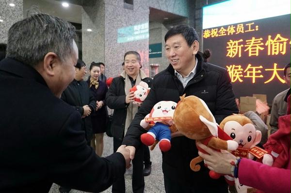 本网讯 羊年喜获丰收果,猴年大吉喜气扬。2月14日,猴年春节后的第一个工作日早上8点20分,在欢乐祥和的气氛中,公司总经理尹正民、党委书记肖黎春及在家领导王晓希、杨光糯、李政、王文桃、侯春、许毅蒙、傅景伟、张立庆、周新风、宋飞宇、赖平、王勤在公司本部一楼大厅迎接上班员工,向大家致以新春的问候,祝愿广大干部员工在新的一年生活幸福、事业顺利,企业兴旺昌盛,前景更加美好!