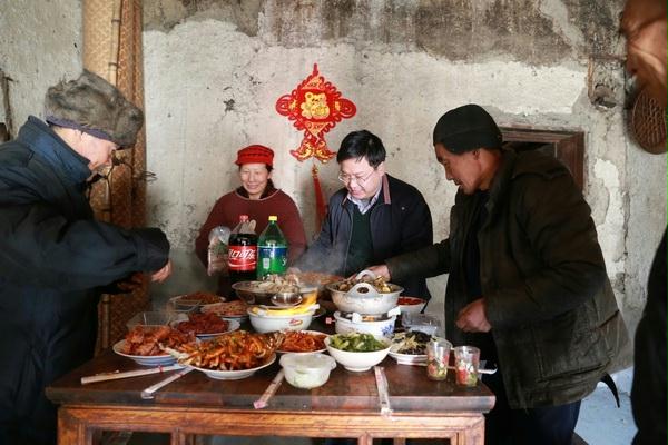 2月7日正值除夕,湖北长阳土家族自治乡龙舟坪镇土地坡村五组“五保户”刘启元的家中一片欢声笑语,国家电网公司在该村驻点扶贫的“第一书记”刘敬华与孤寡老人曹宗茂等共进团年饭,为其送去国家电网公司的温暖。(李萍 摄)