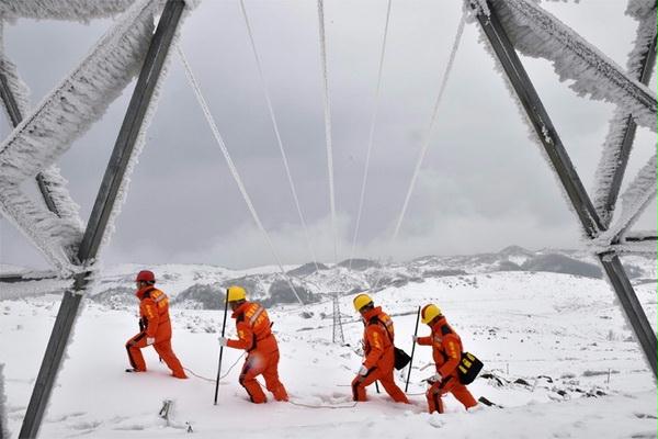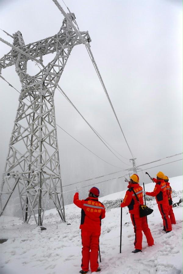 春节期间,为保障宜万、渝利铁路的可靠供电,国网恩施供电公司每天出动线路运检人员70余人次,对运维范围内35千伏及以上跨越铁路的29条36处输电线路开展特巡和排障工作,为电气化铁路的安全可靠供电提供保障,确保春运顺利进行。2月4日,国网恩施供电公司输电线路运维人员在利川市齐跃山检查宜万铁路供电线路的覆冰情况。(张思敏 杨志英 摄)