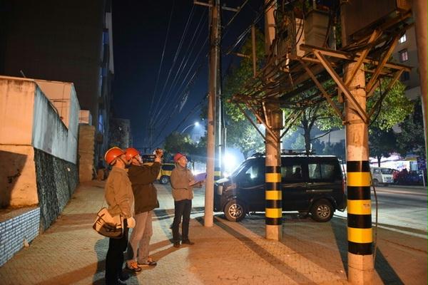 2月7日除夕夜,为及时发现和处理设备缺陷,保证线路的持续可靠供电,国网红安县供电公司员工正在对成龙小区对面的配变进行红外线测温和夜巡工作。(占鹏 摄)