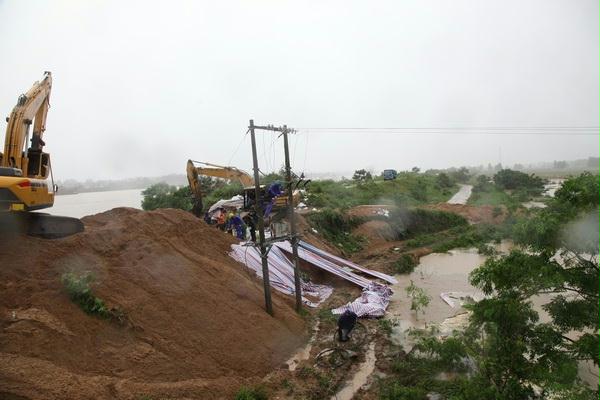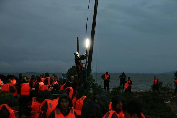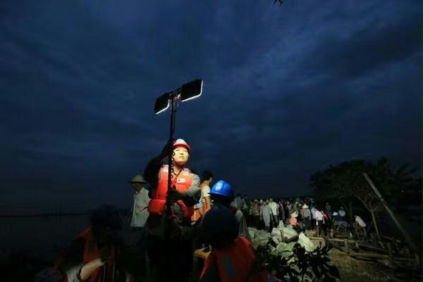 7月2日,黄石大冶三山湖湖堤有溃坝风险,威胁数万人人身财产安全,大冶公司员工在现场安装应急照明灯。