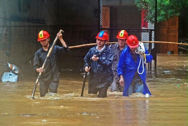 7月1日,红安县重灾区华河老街积水高度超过1米,两个台区未断电,为防止漏电,抢修队员趟水停电。