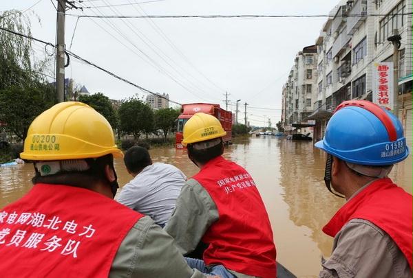 6月30日,咸宁公司供电党员突击队坐冲锋舟进小区排查。