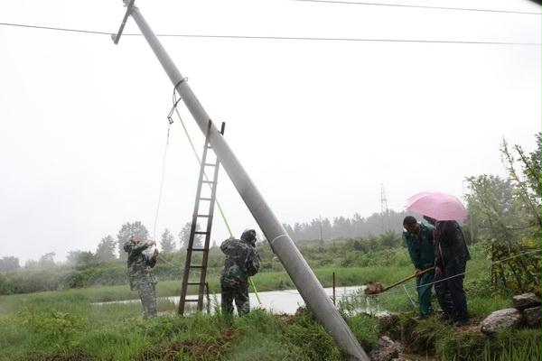 7月1日,暴雨导致广水市秦湾支线18号杆倾斜,广水公司抢修队积极抢修。