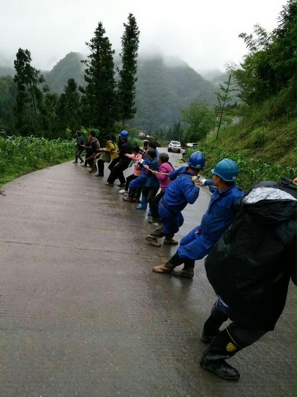 7月1日,恩施利川市忠路镇10千伏钟灵村山体滑坡,大批树枝压在供电线路上,利川公司抢修人员和村民一同清理树障。