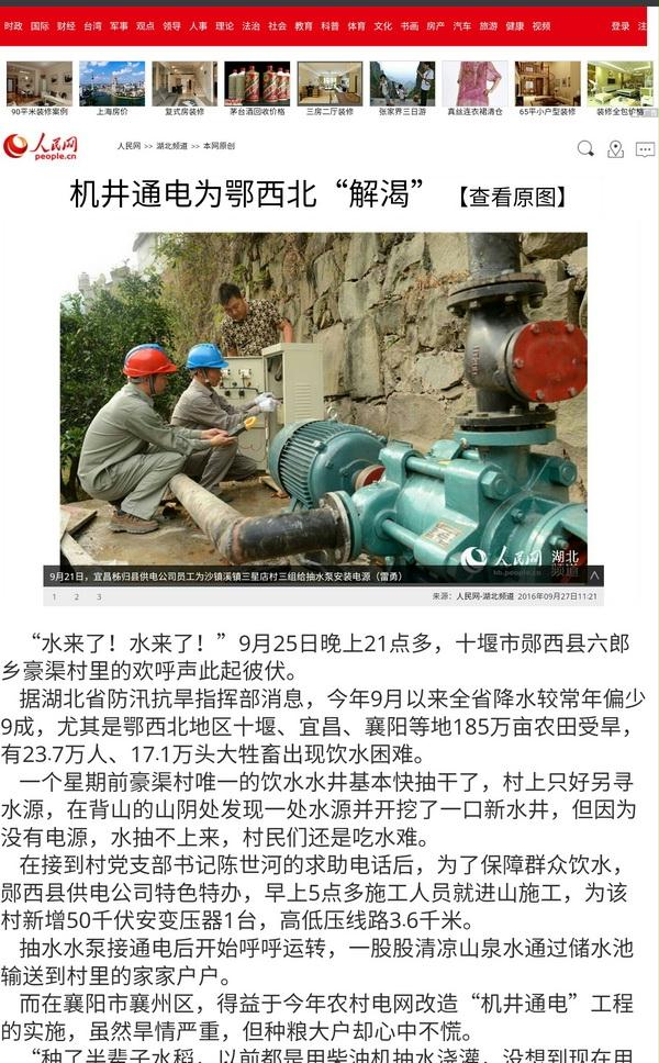 本网讯 9月27日,新华社、湖北日报、国家电网报、新华网、人民网等媒体刊发《国网湖北电力机井通电工程帮鄂西北农田“解渴”》消息,对公司加快农村电网改造,服务全省抗旱夺丰收进行了大篇幅报道。